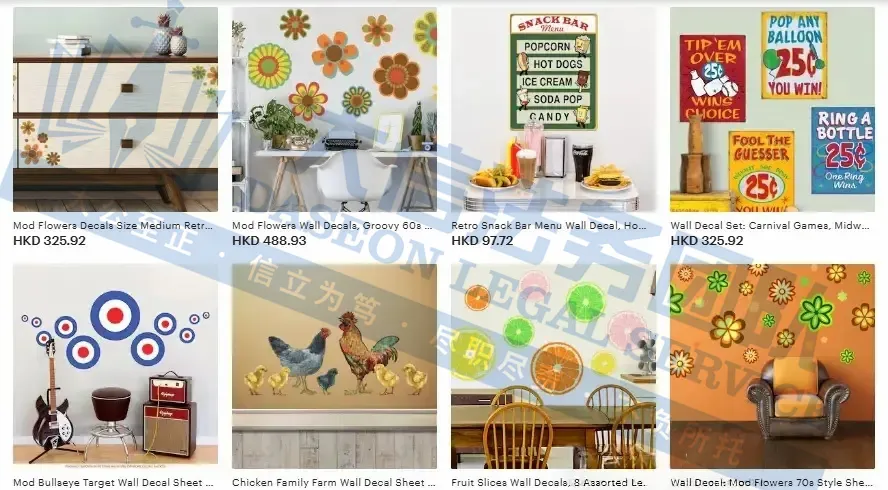 原告是来自英国的插画师、平面艺术家,专门设计以复古风格为灵感来源的服装、乙烯基贴纸、墙面贴花以及精美的壁画,融合复古魅力与鲜明视觉风格,注重曲线与人物姿态的表现力,线条清晰,造型复古,通过Etsy平台将印花服装、墙面壁画与精致贴纸带入千家万户。