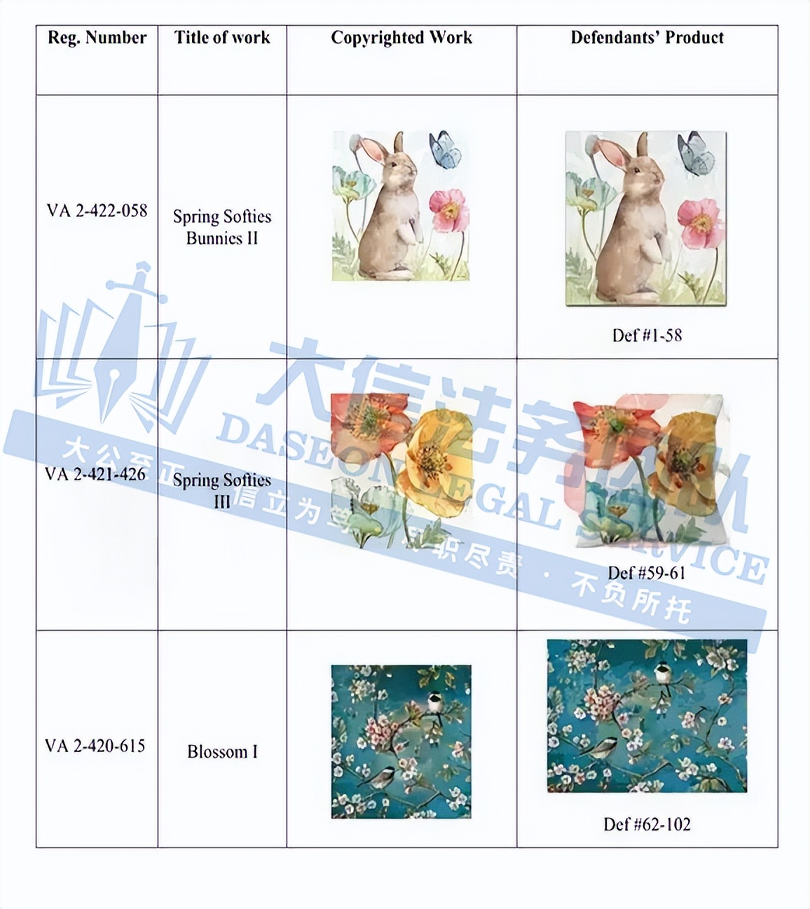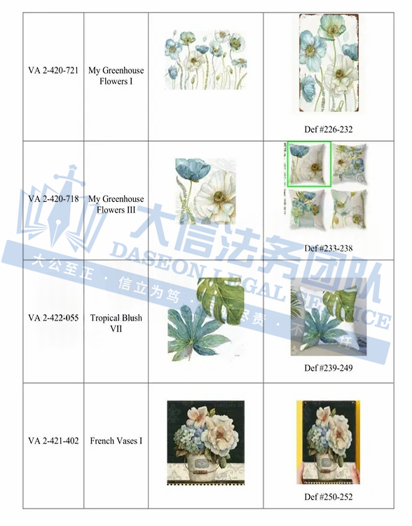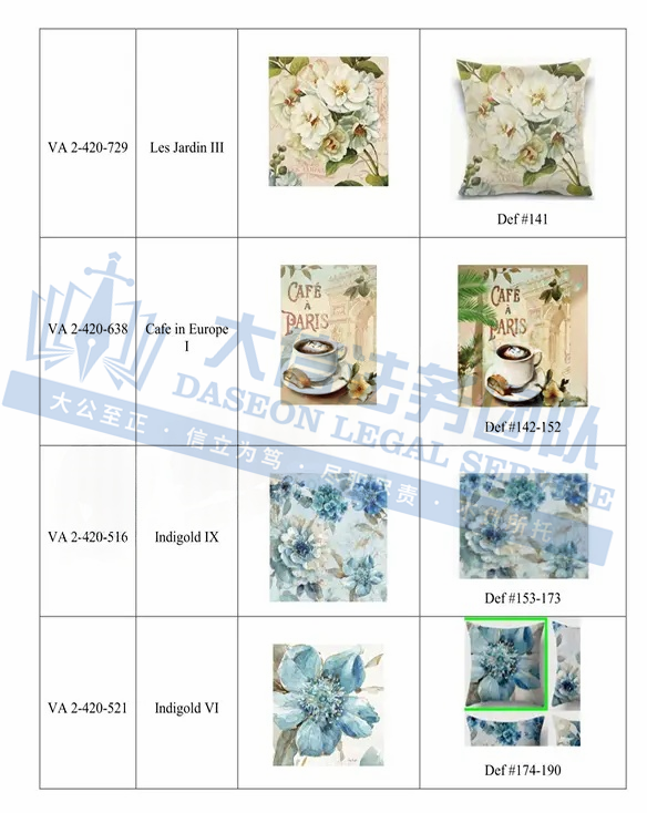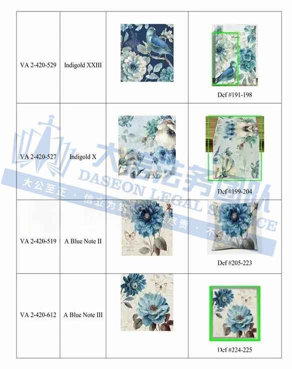 此案为版权维权,涉及3张版权图,版权号为:VA 2-420-560、VA 2-420-556、VA 2-420-532,于2024年9月18日下证,跨境卖家一定要注意检索下架,未经授权不得擅自使用,以下是涉案版权信息,可供卖家参考,避免TRO侵权损失!