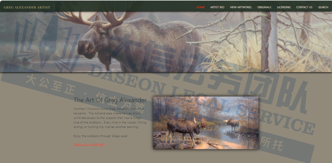 原告是一位全职野生动物艺术家,曾带着画具深入苏必利尔湖畔的原始森林,在木屋中沉淀四年,通过直接观察野生动物习性来磨砺技艺,将对自然的敬畏与理解深入每幅作品,被称为“自然界最真实的写照”,多次荣获州级野生动植物邮票艺术家称号,而Greg Alexander也被称为是美国当代最具影响力的野生动物画家之一。