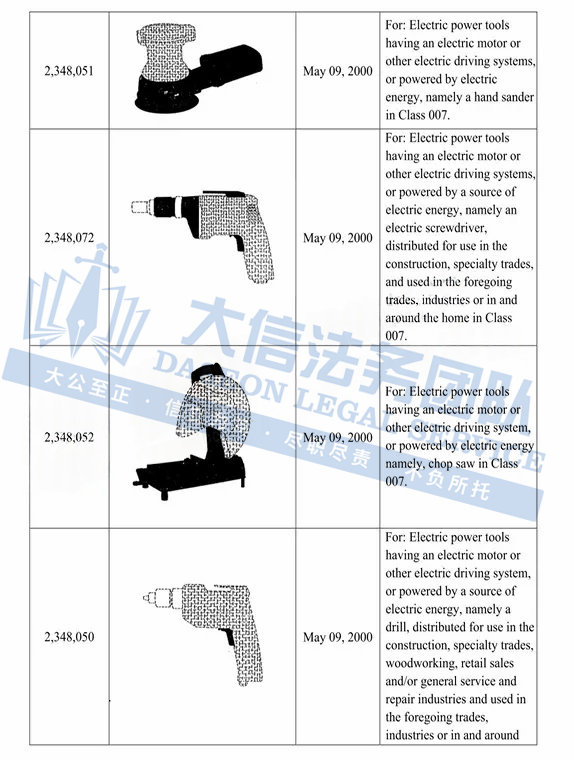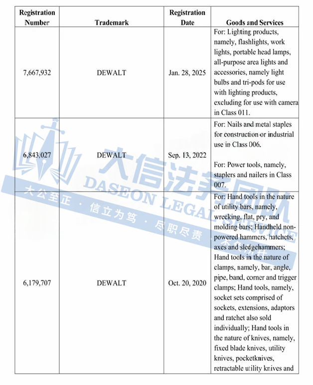 此案为商标维权,涉及超多商标,以”DEWALT“商标词为主,注意,此次是原告首次维权,原告连发两案,来势汹汹,卖家在上架产品时,一定要注意筛查,以下是涉及商标的具体信息,除此之外,官网上的其他作品未经授权不得擅自使用,侵权风险极高,跨境卖家尽快检索下架,避免TRO侵权风险!