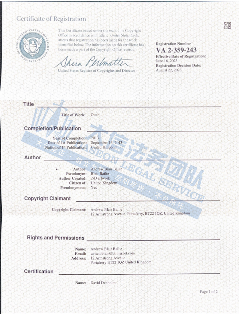 本案为版权侵权,涉及原告1幅水獭版权,版权号:VA0002359243。本案共有28家店铺被波及,以下是涉及版权的具体信息,未经授权不得擅自使用,侵权风险极高,跨境卖家尽快检索下架,避免TRO侵权风险!